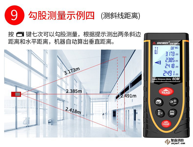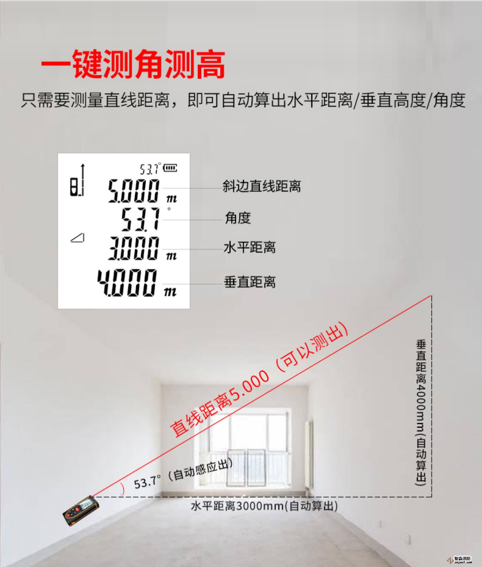 將激活的激光瞄準(zhǔn)目標(biāo)區(qū)域;輕按“測(cè)量”鍵;設(shè)置測(cè)量距離。設(shè)備立即顯示結(jié)果。