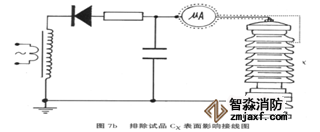 對氧化鋅、磁吹避雷器等試品接地端可拆開的情況下,也可采用在試品的底部(地電位側)串入電流表進行測量的方式。 當要排除試品表面泄漏電流的影響,可用軟的裸銅線在試品地電位端繞上幾圈并與屏蔽線的屏蔽相聯接(見下圖)