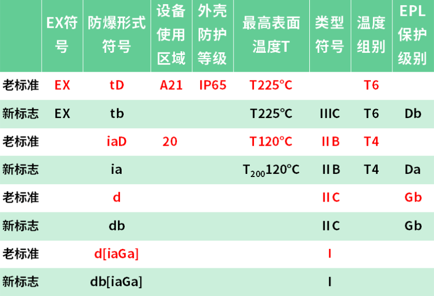 舊標準中,防爆型式常簡化為“d/e/i/t”等單一字母標識,無法體現同一型式下的能力差異。新規采用與IEC一致的“型式+等級符號”組合(如隔爆da/db/dc、增安eb/ec、本安ia/ib/ic、粉塵外殼ta/tb/tc等),將同一保護型式的風險控制能力分層顯性化,使標志與EPL的對應關系更清晰可追溯——同為隔爆型式,da、db、dc代表不同的故障假設與適用邊界,精準匹配不同風險等級場景。