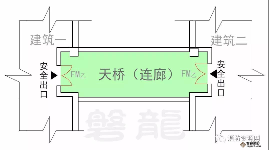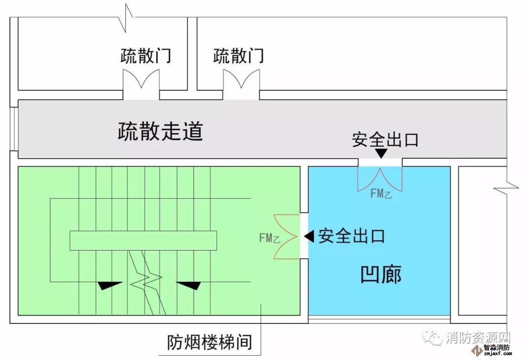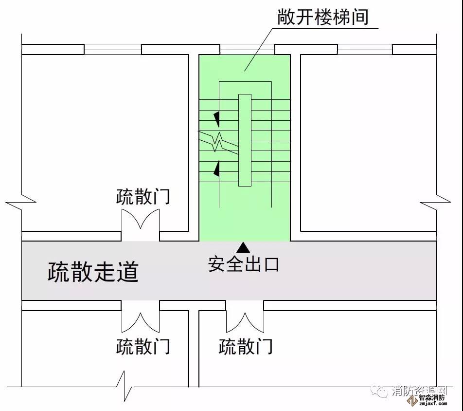 疏散樓梯間、防煙樓梯間的前室、室外樓梯以及符合要求條件的連廊和天橋等,通常認(rèn)為是相對(duì)安全的區(qū)域,火災(zāi)條件下人員進(jìn)入這些區(qū)域,即可認(rèn)為到達(dá)安全區(qū)域。因此,這些區(qū)域的入口通常稱為安全出口,比如敞開樓梯間的出口、封閉樓梯間的門、防煙樓梯間的前室門,室外疏散樓梯的出口,符合條件的連廊和天橋出口,以及直接通向室外安全區(qū)域的房門等,這些出入口均屬于安全出口。