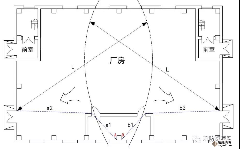 2、規(guī)范圖示爭(zhēng)議:新版《建規(guī)》圖示3.7.4,標(biāo)示了廠房?jī)?nèi)任意一點(diǎn)到安全出口的直線距離(圖二),本示例存在室內(nèi)隔間,對(duì)于隔間內(nèi)的任意一點(diǎn),應(yīng)采用行走直線距離計(jì)算,宜應(yīng)采用圖示三的方案,A點(diǎn)至安全出口的疏散距離為(a1+a2),B點(diǎn)至安全出口的疏散距離為(b1+b2)。